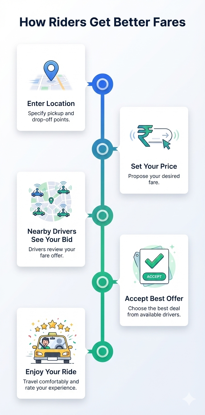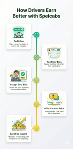 How Spelcabs Works for Riders and DriversSpelcabs uses a simple ride-bidding process where riders and drivers agree on a fair price before the trip begins. Three simple steps Request a RideEnter your destination and suggest a fare. Drivers RespondNearby drivers accept or counter your offer. Ride & RateChoose the best offer, ride, and rate your experience. How It Works for Riders Accept trips based on distance, fare, and timing. The more you drive, the more you earn without unfair cuts.Request a ride and suggest your fareGet offers from nearby driversCompare price, ETA, and driver ratingConfirm the ride, track it, and rate your driver How It Works for Drivers Accept trips based on distance, fare, and timing. The more you drive, the more you earn without unfair cuts.Review incoming ride bidsAccept the fare or counter with your pricePick up the rider and complete the tripGet rated and build your driver profile